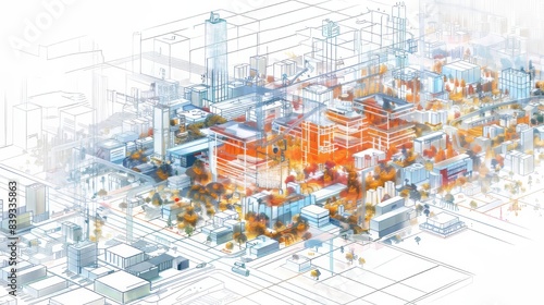 A geometric diagram showing urban development, with many transparent layers, in the style of luminous landscapes, white background, isometric, city vistas with cartelcore, luminous imagery, pseudo-rea