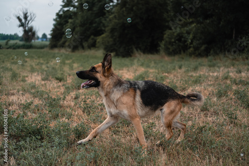 A German shepherd plays with soap bubbles. The dog catches soap bubbles with its mouth, games with the dog in nature, in the fresh air. Active German shepherd.