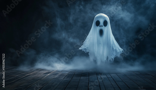 a ghost with two eyes and a mouth floating in the air on a wooden floor, against a dark background with fog