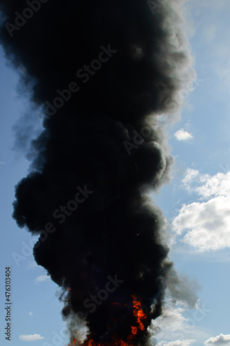 A giant high fire with black smoke of burning oil. The flame is explosive large and firefighters.