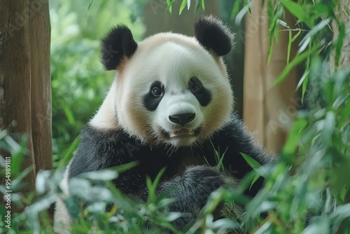 panda, giant, bear, mammal, animal, wildlife, forest, jungle, bamboo, green, leaf, black, white, fur, cute, adorable, nature, zoo, conservation, endangered, china, asia, sitting, eating, looking, eye, nose, mouth, teeth, tongue, claw, paw, tail, bush, tree, tree branch, trunk, background, blurry, habitat, environment, photo, image, snapshot, picture
