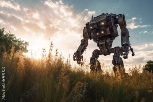 A giant robot walking through a peaceful meadow, blending nature and technology