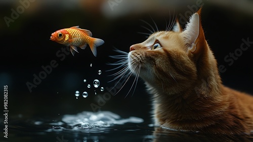 cat, ginger, goldfish, water, jump, splash, pet, animal, curious, funny, playful, domestic, cute, adorable, wildlife, nature, fish, duck pond, lake, stream, aquatic, orange, red, brown, green, black, white, eye, whisker, tail, paw, fur, creature, mammal, vertebrate, fauna, closeup, portrait, head, face, look, stare, watch, observe, background, depth, field, shallow