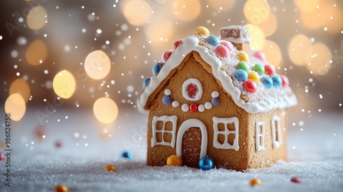 A gingerbread house decorated with colorful candies, standing on a snowy surface with a bokeh background of warm lights.