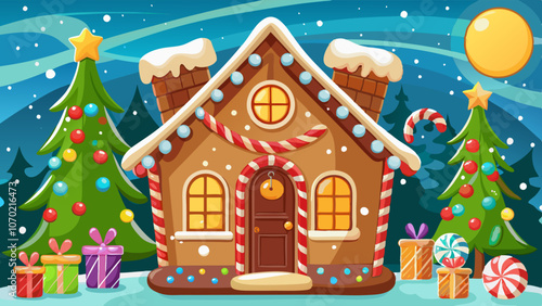 A gingerbread house the size of a real house stands in the middle of a snowy forest with presents lying nearby