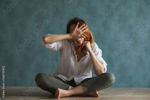 graceful, clap, powder, people, concept, adult, male, light, soul, sexy, active, style, white, pretty, body, cloud, flour, action, attractive, fashion, hand, beauty, beautiful, female, girl, creative, woman, young, hair, haze, modern, dark, move, motion, portrait, stage, lady, movement, splash, posing, adorable, home, red hair, hand, nail, finger, palm, blouse, shirt, blue