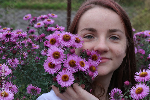 A girl among pink flowers