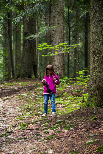 a girl feeding a carpathian squirell in the forest, Skole Beskids National Nature Park, Ukraine