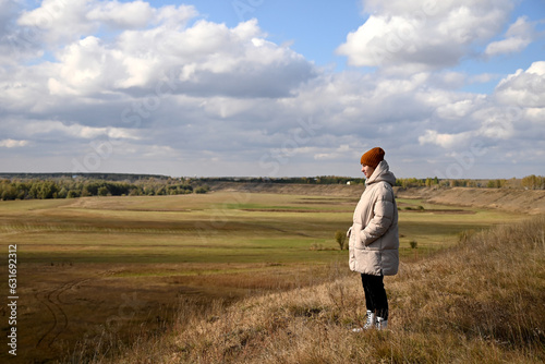 A girl in a light jacket and a brown hat looks at the autumn landscape