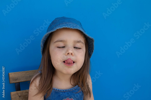 A girl in a Panama hat grimaces and shows her tongue against a blue isolated background