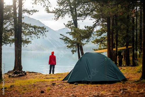 a girl in a red sweater drinks coffee on the shore of a mountain lake. Siberia. Altai