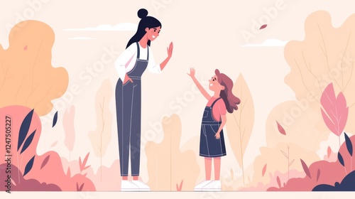 girl, overall, mother, smiling, waving, camera, trousers, shirt, pink shirt, blue shirt, bun, hand raised, high five, happy, family, together, mother, daughter, vector, minimalistic, illustration, cheerful, eltern, love, affection, gesture, bonding, joyful, clothing, family portrait, fun, casual attire, interaction, cute, female, lifestyle, standing, togetherness, simple