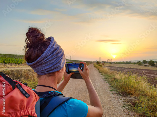 A girl is taking a photo of the path just outside Los Arcos at sunrise