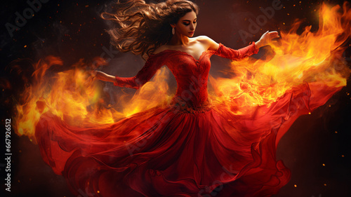 A girl performs a fiery flamenco dance, her movements echoing the passionate intensity of Spanish tradition amidst swirling flames.