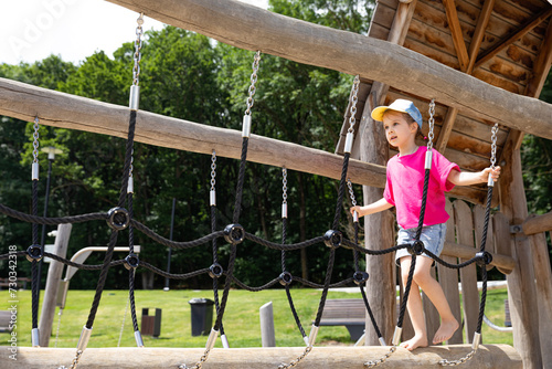 A girl playing outdoors at the playground in the park on a hot summer day. children's playground in a public park, entertainment and recreation for children, mountaineering training.