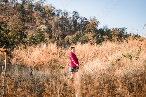 lone, mountain, dry, red, travel, nature, view, tour tourism, grass, sun, forest, autumn, brown, tree, wood, fashion, background, lifestyle, girl, hiking, traveler, woman, calm, relax, vacation, walking, happiness, fall, active, discover, adventure