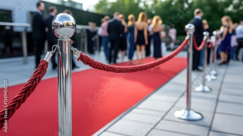 A glamorous red carpet event unfolds under a sunny sky, with elegantly dressed attendees chatting in the background.