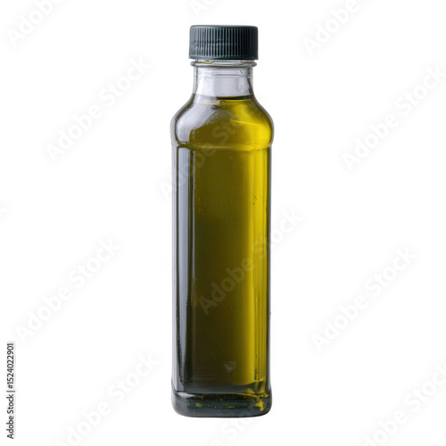 A glass bottle filled with golden olive oil, designed for culinary use. Perfect for dressing salads or cooking. Captured against a clean white background.