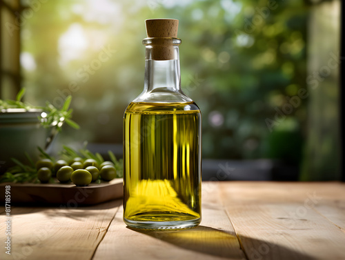 A glass bottle with olive oil and green olive twig on wooden table, blurred green outdoor background