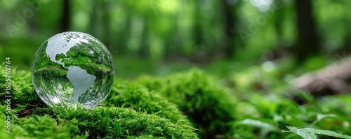 A glass globe stands on moss in the forest, surrounded by lush greenery and sunlight filtering through the leaves