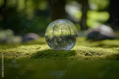 A glass globe with a small green forest on the moss. Taken by macro photography on a green background.