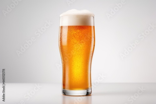 A glass of beer with a foam on a white background.