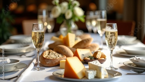 dinnerware, plate, bowl, glasses, champaign, food, table, cheese, tableware, bread, dinner, wine glass, wine