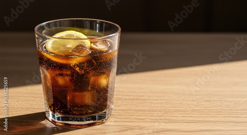 glasses, cola, ice, lemon, slice, drink, cold, refreshment, summer, soda, fizzy, sweet, iced, wooden, table, light, shadow, closeup, transparent, carbonated, cool, beverage, chilled, refreshing, summer, delicious, citrous, fruit, tabletop, soft drink, cold drink, sugary