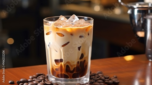 iced, hot drink, brown, beverage, drink, coffee bean, ice cube, shaped, transparent, glasses, cup, bar, counter, wooden, metal, grate, grill, ambience, atmosphere, fuzzy, blurry, background, lighting, faint, item, decor, cafes, espresso, barista, chilly, cool, refreshing, casual attire, dining, relaxation, afternoon, leisure, treat, indulgence, caffeinated, creamy, sweet, sugar, milk, foam, cold