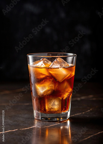 A glass of dark beverage with ice cubes sits on a polished surface, illuminated against a dark background, creating an inviting atmosphere.