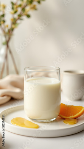milk, glasses, orange, plate, health food, beverage, dairy product, breakfast, drink, juice, table, kitchen, meal, fruit, citrous, smoothie, alimentary, refreshing, creamy