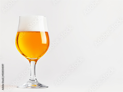 A glass of golden beer with a frothy top placed against a clean white background. Refreshing beverage concept, ideal for bar or pub themes.