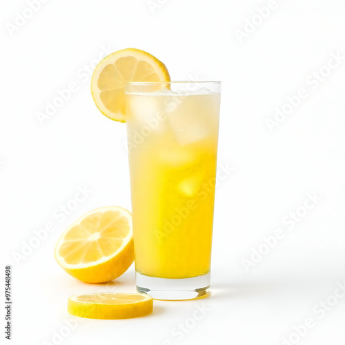 a glass of lemon juice with mint leaves garnish, surrounded by fresh oranges and mint leaves, lemon, white background