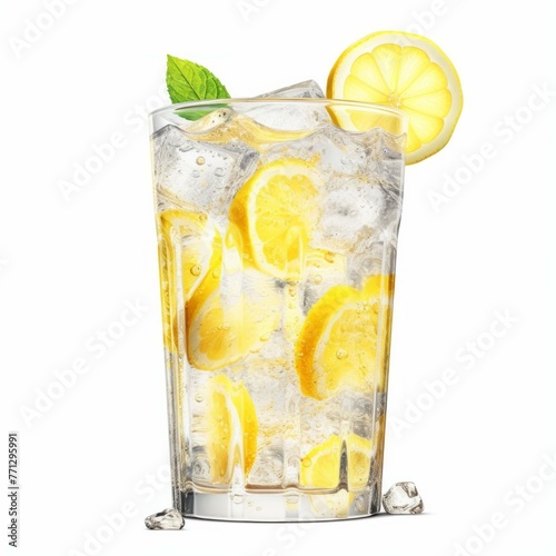 A glass of lemonade with ice cubes and slices of lemon, isolated on white background