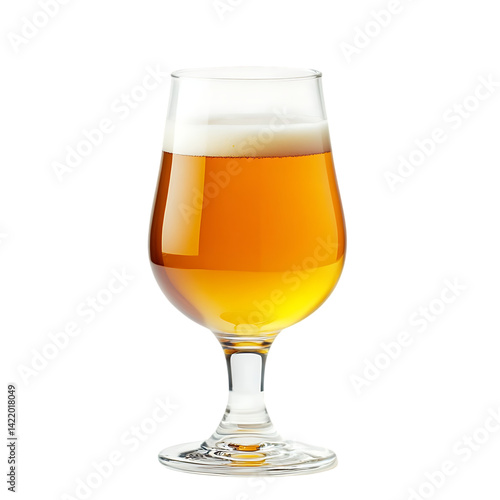 A glass of light amber craft beer with a fluffy head.