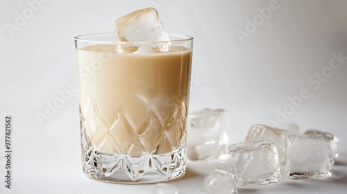 A glass of milk-based Irish cream liqueur with ice cubes, isolated on a soft white background for a modern, indulgent vibe