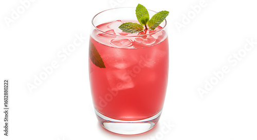 A glass of rhubarb punch with ice cubes and mint garnish in a curved tumbler, vibrant pink color, isolated on white background
