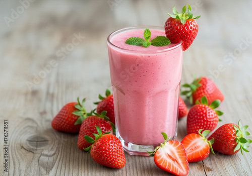 A glass of vibrant pink strawberry smoothie, topped with a mint sprig, is surrounded by fresh, whole, and halved strawberries on a wooden table. The beverage is thick and looks refreshing.