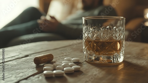 A glass of whiskey sits on a wooden table beside pills, with a blurred figure in the background, creating a contemplative atmosphere.