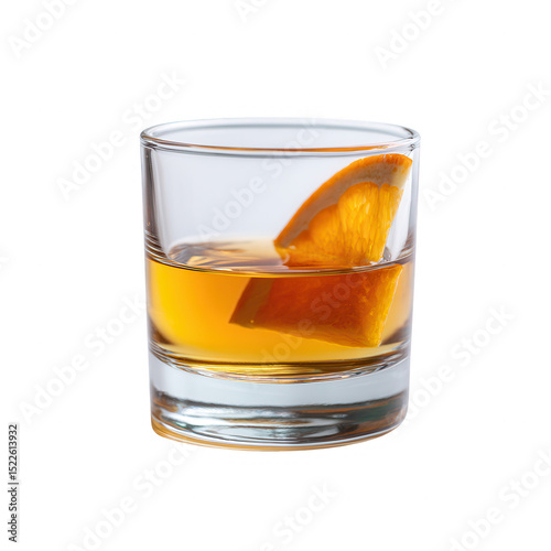 A glass of whiskey with a slice of orange, showcasing the rich amber color and refreshing citrus twist, ideal for any cocktail enthusiast.