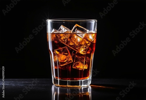A glass of whiskey with ice cubes in it.