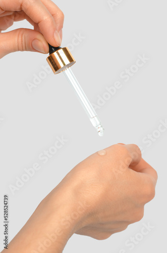A glass pipette in a woman's hand drips essential oil onto her hand. Cosmetic procedures
