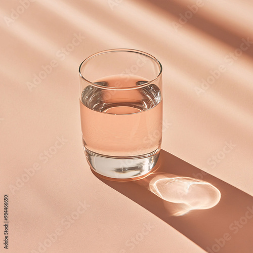 A glass with clean clear water and sharp shadows stands on a table. glass of water