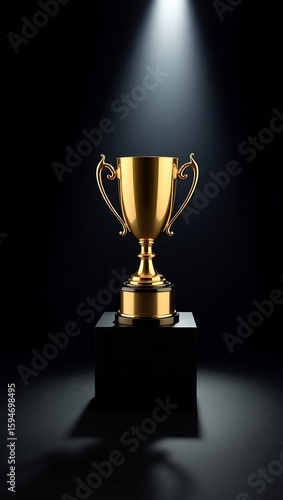 A gleaming golden trophy stands proudly on a dark pedestal illuminated by a dramatic spotlight against a stark black background symbolizing achievement and victory