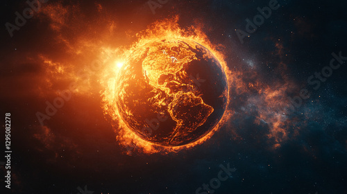 A globe of Earth engulfed in flames, with continents visible, symbolizes urgent environmental crisis and the consequences of modern industrialization on the planet's future