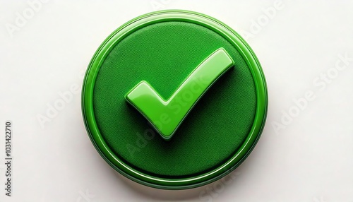 A glossy green button featuring a prominent checkmark, symbolizing approval, confirmation, or success.