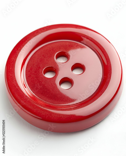 A glossy red button with four holes sits against a white background, showcasing its shiny surface and circular shape.