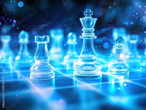 A glowing chess scene featuring translucent pieces against a vibrant blue background, symbolizing strategy and intellect.