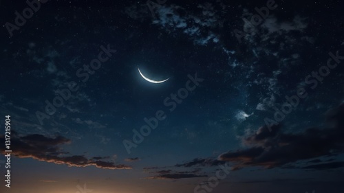 A glowing crescent moon with twinkling stars and delicate thin clouds in a peaceful night sky.