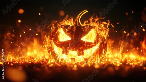 A glowing Halloween pumpkin surrounded by flames, capturing the essence of a spooky and festive atmosphere.